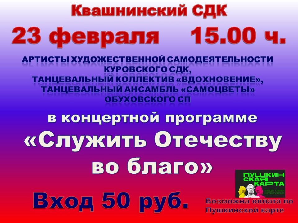 23 февраля 2025 года в 15:00 ч. Квашнинский сельский Дом культуры приглашает на концертную программу "Служить Отечеству во благо"