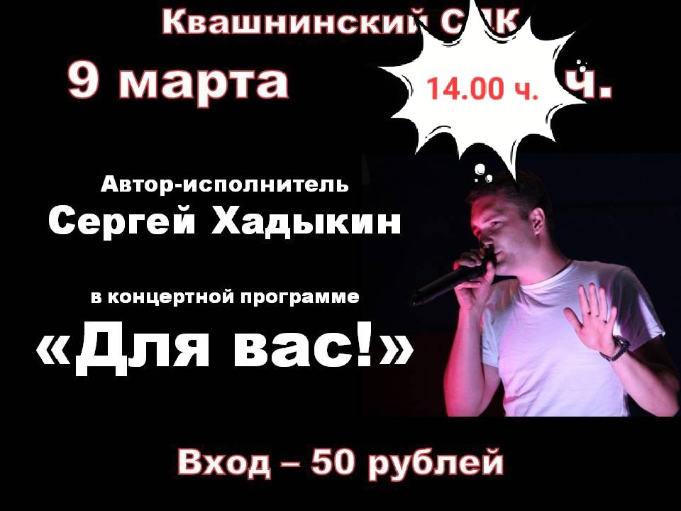 Милые женщины! Галантные мужчины! Приглашаем вас провести весенний, нежный и солнечный день вместе, слушая душевные песни автора-исполнителя Сергея Хадыкина. Пусть погода порадует нас теплом, а хорошая музыка и профессиональное исполнение подарят незабываемые приятные моменты. Ждем вас 9 марта в 14.00 в Квашнинском Доме культуры. Вход - 50 рублей