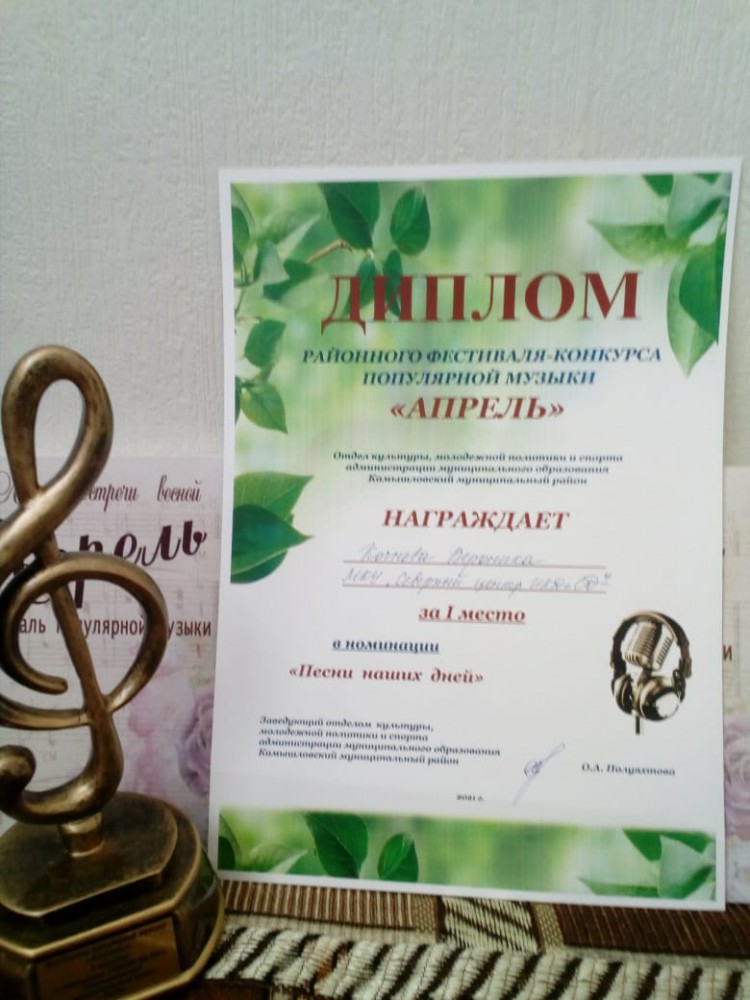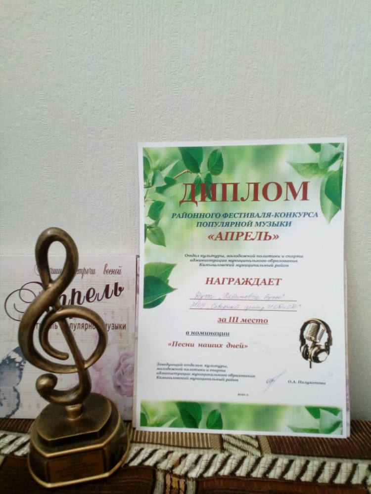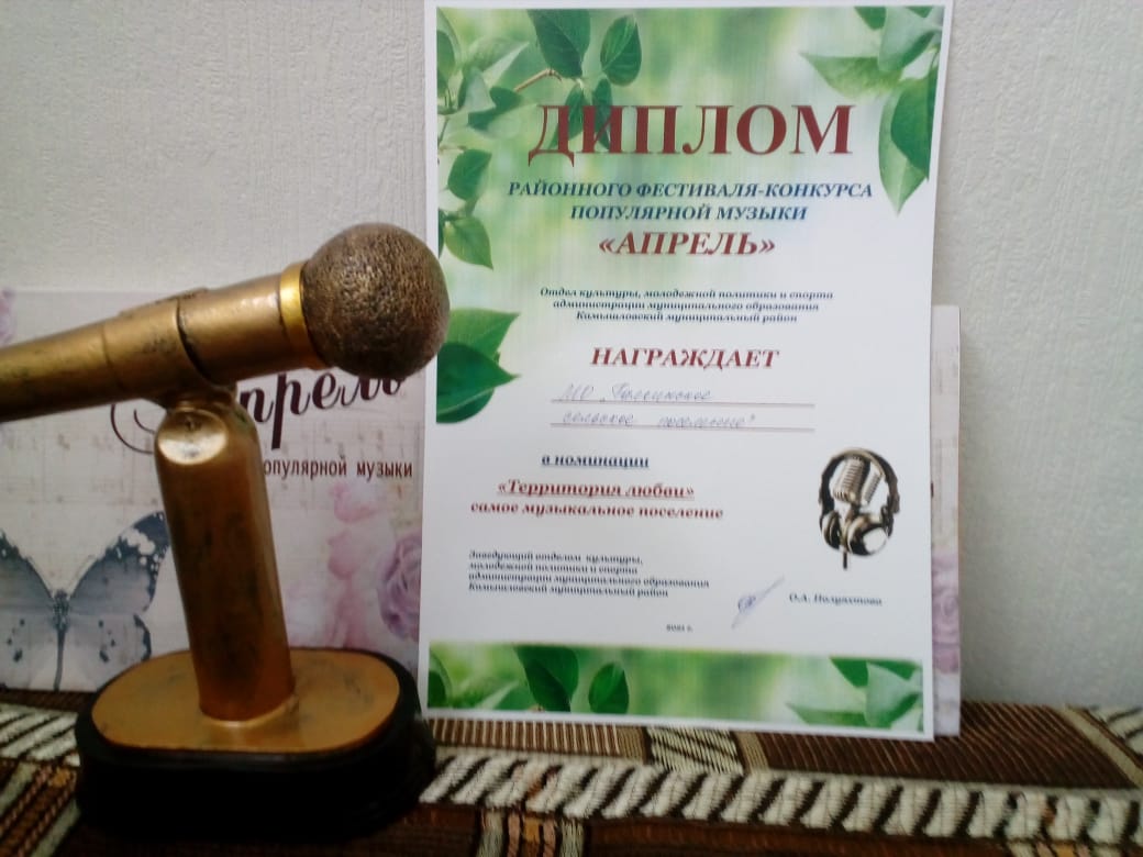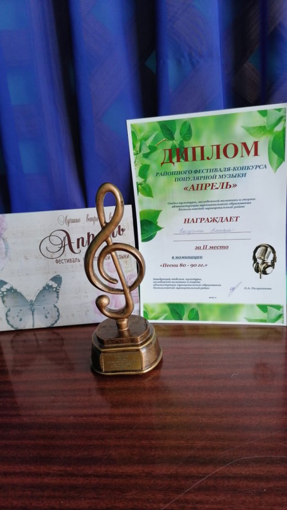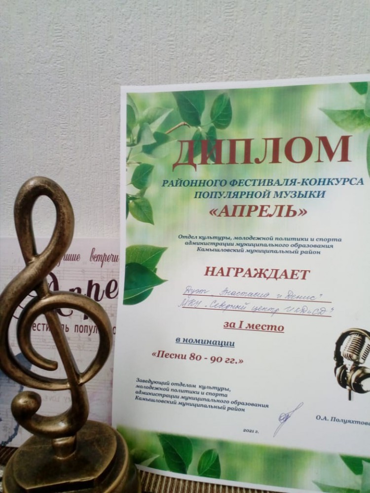 24 апреля в Камышловском районе состоялся фестиваль-конкурс популярной музыки "Апрель". Организатор конкурса - Отдел культуры, молодежной политики и спорта администрации МО Камышловский муниципальный район. Специалисты домов культуры и участники творческой самодеятельности Северного центра культуры приняли в нем участие. По итогам всего конкурса самым музыкальным было признано МО "Галкинское сельское поселение"